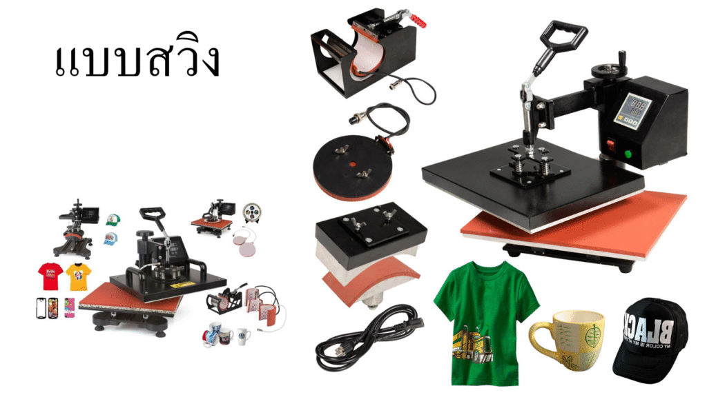เครื่องรีดร้อนแบบสวิงได้ มีสองขนาด เหมาะกับงานพิมพ์ขนาด A4 และ A3 ครับ ข้อดีคือ สวิงออกด้านข้างได้ ทำให้ทำงานง่าย ไม่ร้อนหน้าเรา ทำให้ปูเสื้อง่าย ปรับแรงอัดได้ละเอียดกว่าแบบคันโยกครับ