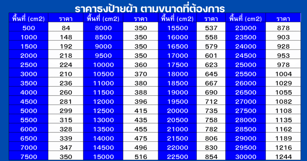 ตารางราคานี้ สามารถใช้ได้กับ ป้ายผ้าดิบพิมพ์ลาย ด้วยนะครับ