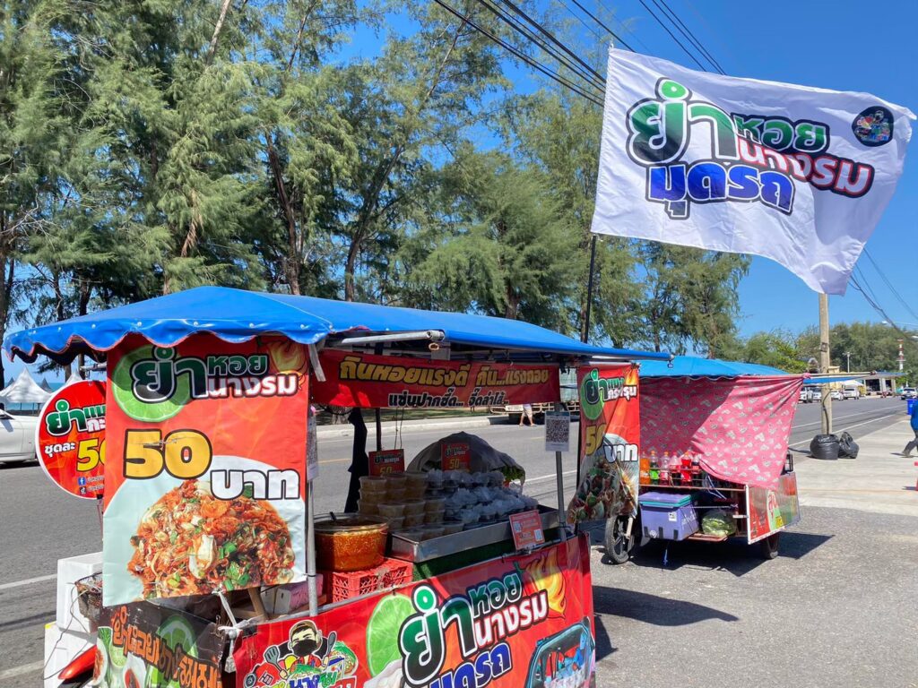 ป้ายผ้าพิมพ์ลาย ไม่เพียงบอกว่าขายอะไร แต่ยังทำให้ร้านดูคึกคัก เป็นจุดสนใจ และถ่ายรูปแชร์ต่อได้ง่าย