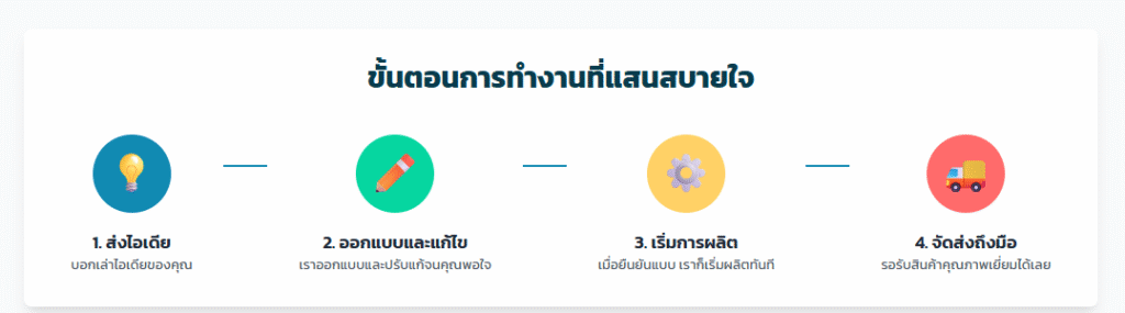 ตั้งแต่ขั้นตอนการ ให้ข้อมูลแบบตรงไปตรงมา โปร่งใส่แจ้งข้อดี ไม่ปกปิดข้อด้วยของแต่ละสินค้า ออกแบบฟรี ลูกค้าจะมีแค่ไอเดียคร่าวๆมาเราก็จัดการให้เกิดเป็นกราฟฟิกพร้อมผลิตจริงได้ แน่นอนว่า เราจะปรับแก้แบบให้จนพอใจ ก่อนผลิตจริง ระยะเวลาการผลิต สามารถยืดหยุดเร่งรัดตามลูกค้าต้องการ เนื่องจากเรามีวัสดุดิบต่างๆและทีมงานมืออาชีพที่พร้อมทำงานแบบเร่งด่วน