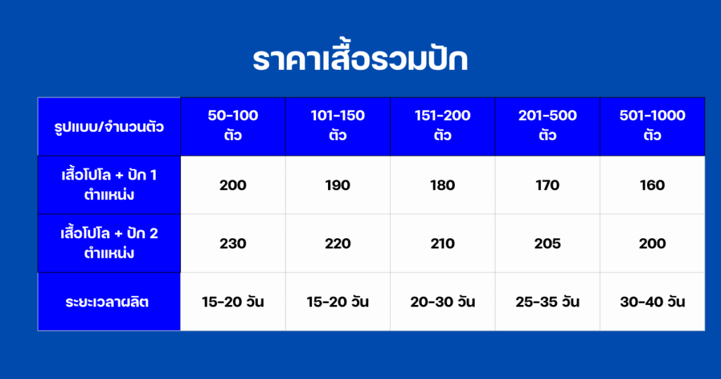 ราคาในตารางคือ คละไชต์ SS – 3XL ไซส์ 4XL ขึ้นไป เพิ่ม 50 บาท